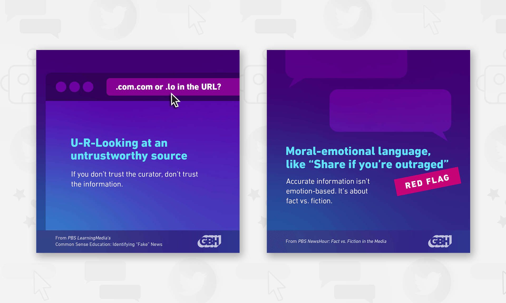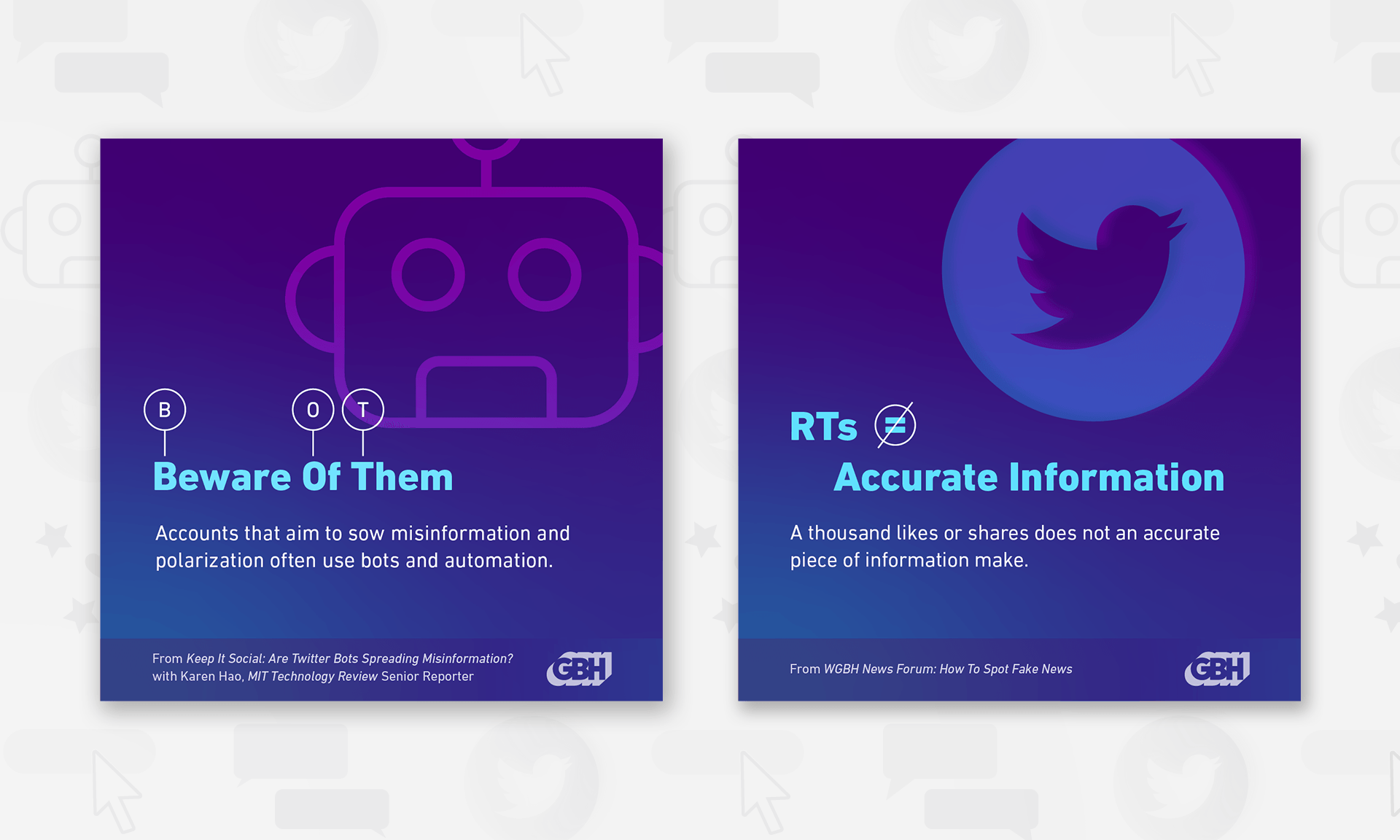 Shareable social media graphics provided viewers with advice and linked them to GBH's Combating Disinformation landing page. With bright icons and illustrations set against a deep blue background, the branding conveys the seriousness of the subject matter while still remaining approachable.