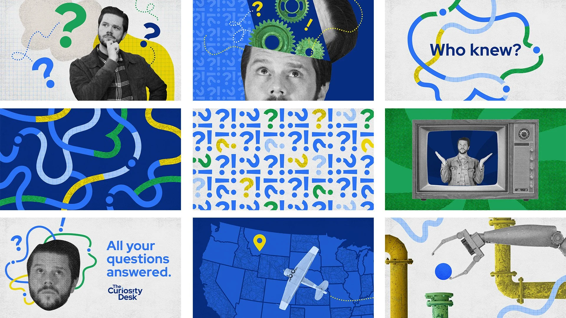 GBH Creative was tasked with developing an identity for The Curiosity Desk that reflected the show’s lighthearted, exploratory energy and the host’s charismatic personality. As the designer on this project, I created the logo, visual system, and graphic elements for use in videos. In the logo and graphics, dots travel along meandering lines like curious trains of thought. Cut paper elements allow for quirky juxtapositions in collages and give the brand a freeform, creative feeling.