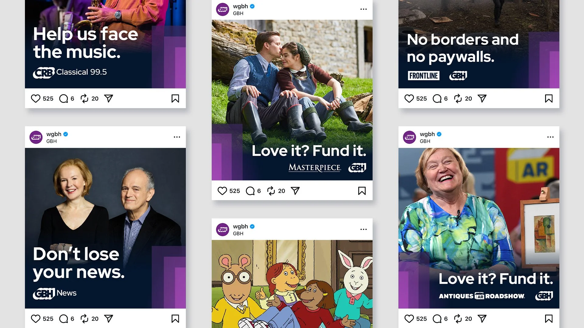 I created the look for this campaign and designed a wide variety of assets across print and digital media. The campaign design uses stark white type on a dark background and a bold, repeated crop of the GBH logo. The repeated logo crop gives a sense of depth and forward motion, reflecting GBH’s intent to remain a strong media force long into the future.